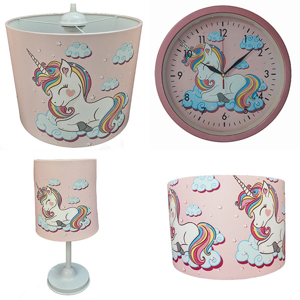 لوستر و آباژور کودک مدل تک شاخ کد 40229 به همراه چراغ خواب و ساعت مجموعه 4 عددی